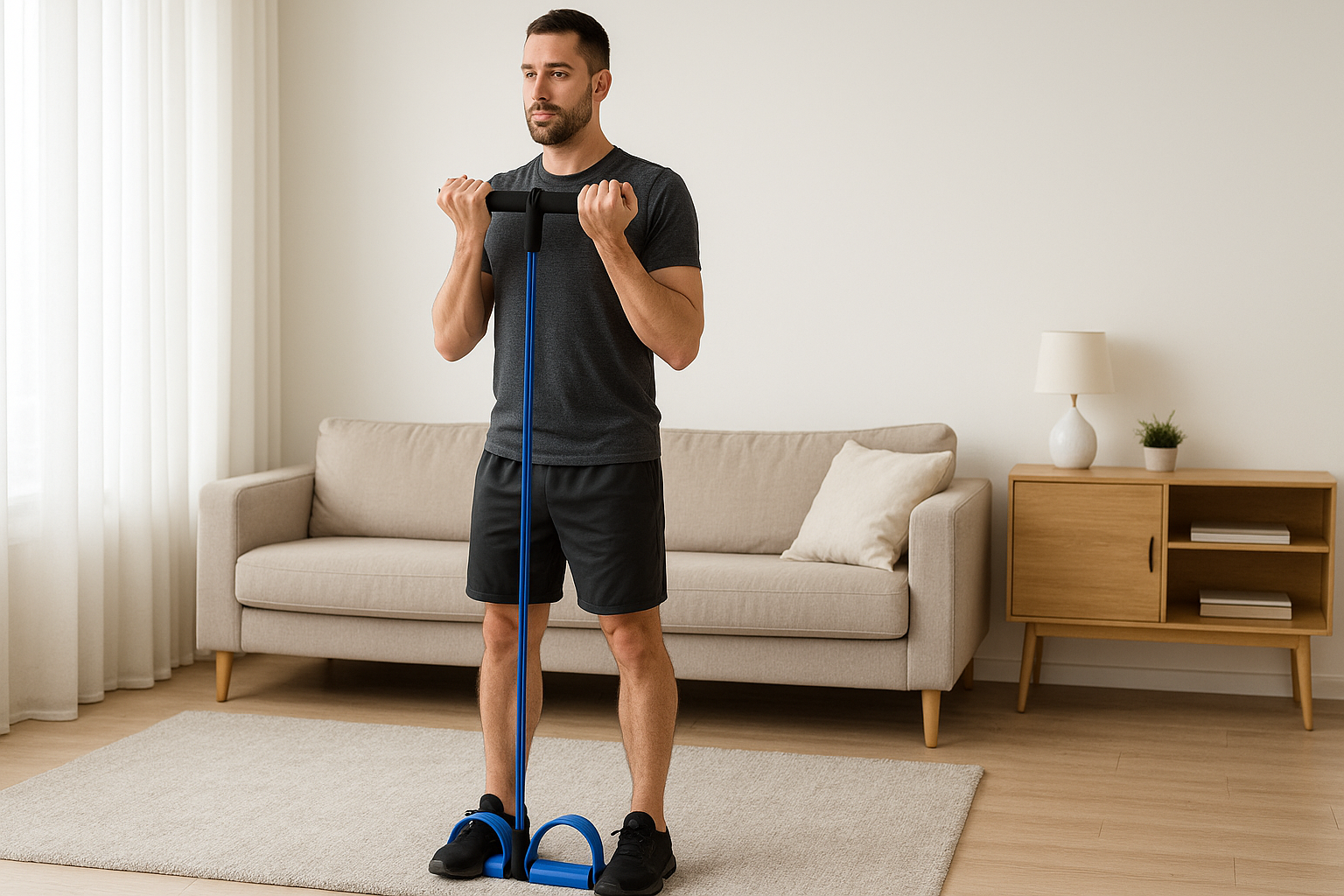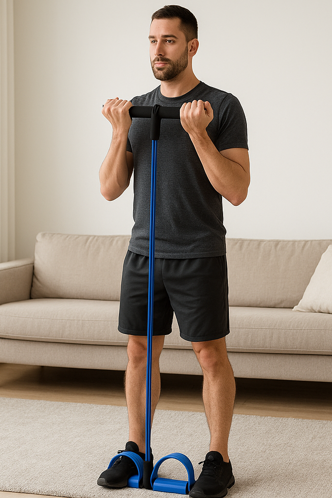 Convierte cualquier rincón de tu hogar en tu propio gimnasio. Con la banda elástica con pedales podrás trabajar brazos, abdomen, piernas y glúteos con una sola herramienta. Es ligera, portátil y muy fácil de usar: solo coloca tus pies, sujeta los agarres y empieza tu rutina.